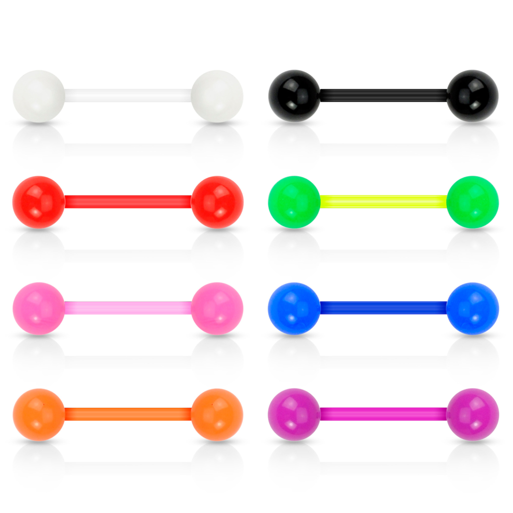 I dette tilbud får du hele 8 tungepiercinger i hver sin farve der er lavet i PTFE/bioplast. PTFE er et blødt og fleksibelt plast materiale som har adskillige fordele. Det er meget behageligt i brug, netop fordi staven er fleksibel og derfor vil genere din tunge mindst muligt. Slår du "krøller" på tungen vil staven altså "krølle" med. Man bevæger faktisk sin tunge en hel dag hver dag, så lige præcis i en tungepiercing kan det være en kæmpe fordel med en stav som følger tungens bevægelser.