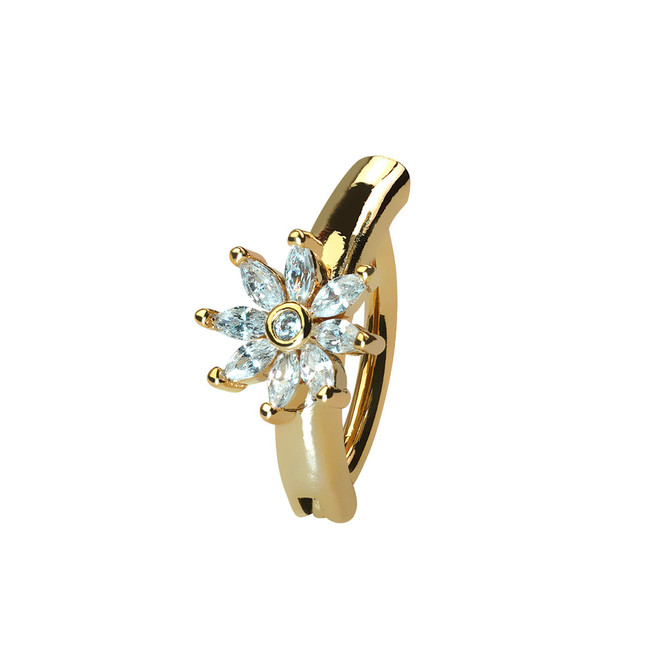 Denne stilfulde clicker-navlering har en funklende blomst i midten. Blomsten består af 9 sten af kubisk zirkonia. Smykket fås i farverne guld eller sølv.