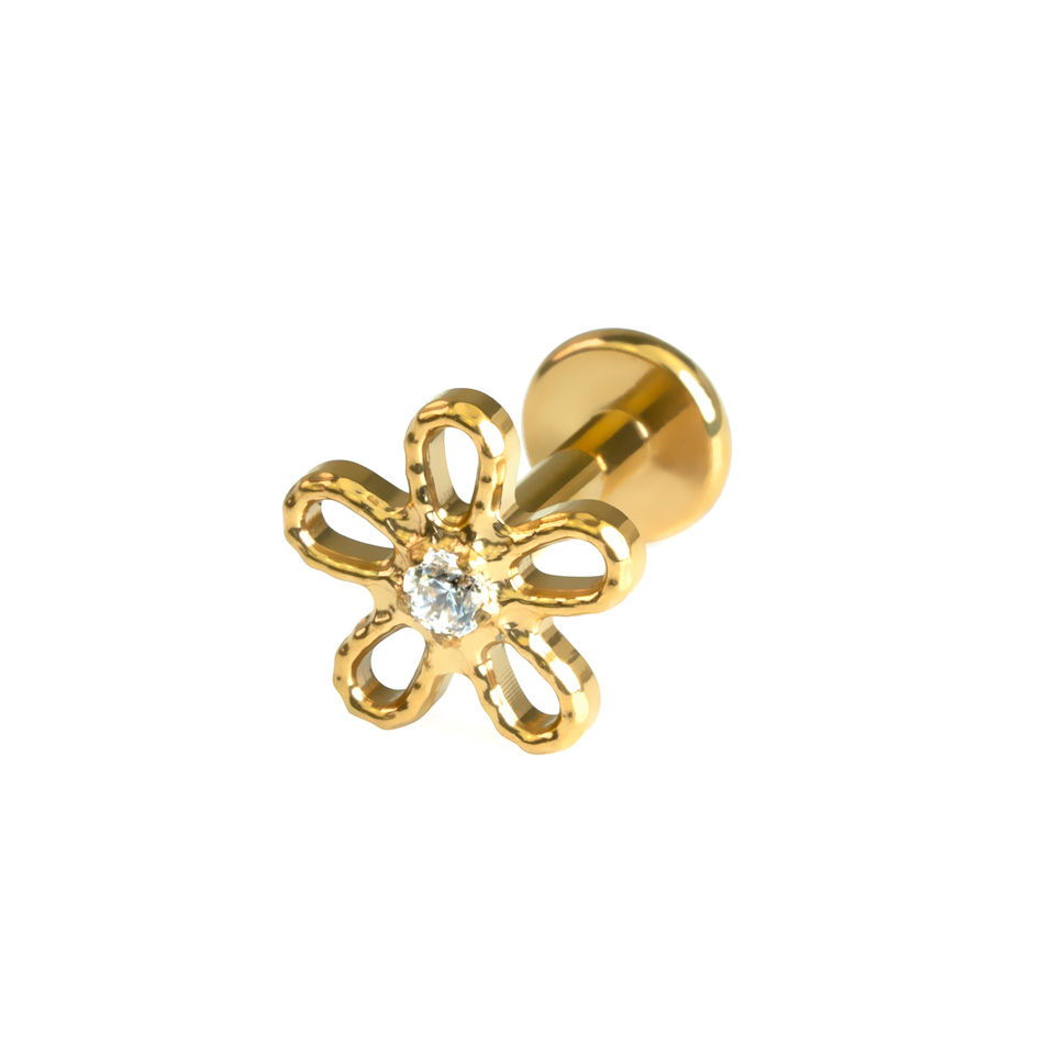 Vores skønne labret formet som en tusindfryd har en CZ-sten i midten, der giver en ekstra gnist. Med indvendigt gevind i staven er smykket meget nemt at tage på - du fører ganske enkelt den glatte stav igennem din piercing og skruer toppen sikkert på plads. Smykket er lavet af allergivenlig titanium, ideelt til følsom hud. Fås i farverne guld eller sølv, og du kan også vælge den længde, der passer din piercing bedst. Giv dit look et sødt touch med dette design.