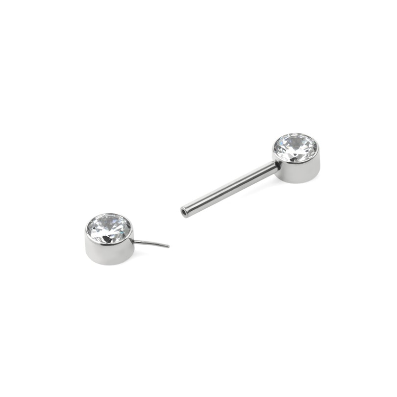 Brystpiercingen du ser her er uden gevind og andre besværlige låsemekanismer. Den består af en 14 mm lang og 1,6 mm tyk stav med et lille 0,55 mm hul i hver ende. I det hul sidder en lille stift der er fæstnet på en kugle. Kuglen er flad på bagsiden og ca. 4 mm høj og 6 mm i diameter. I midten af kuglen sidder en sten. Stenen vælger du selv farven på.