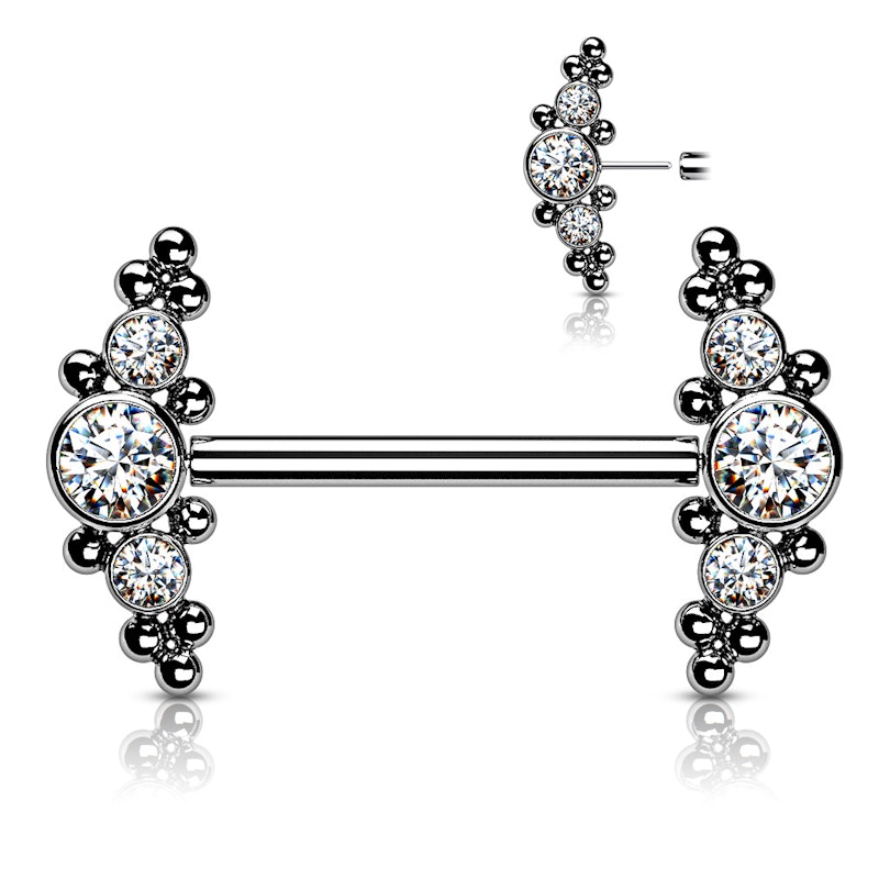 Kvalitet, fordi smykket udelukkende er lavet af titanium, både staven og de to klynge-ender. Enderne er klynger fordi de består af både sten og små kugler. Der er én stor sten i midten og to mindre ved siden af. På de sten er der påmonteret små kugler, som får hele smykket til at ligne en klynge af sten og kugler. Stenene er indfattet i stålet, som er flad bagpå. Dermed lægger smykket sig op ad dit bryst, alt afhængig af hvor på brystvorten du er piercet.