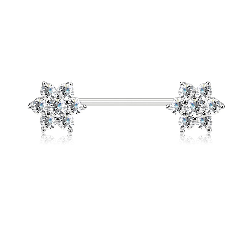 Super fin, og elegnt brystpiercing med den fineste glimtende blomst på begge sider af staven.