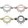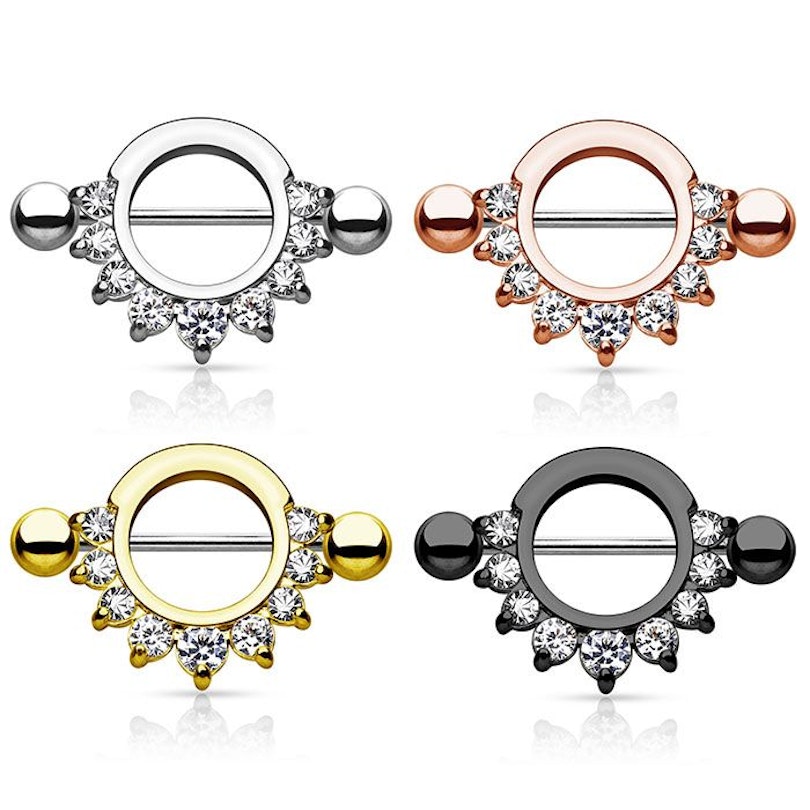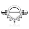Er det tid til at forkæle din brystpiercing med et pirrende nyt smykke, så er dette smukke brystskjold, måske lige præcis det du går og leder efter. Denne brystpiercing består af en stav som går gennem en lukket ring, hvoraf den nederste del af ringen, har form som en flot stenbesat halvmåne. Buen rummer i alt ni smukke dråbeformede sten, som tilsammen danner den flotte halvmåne.
