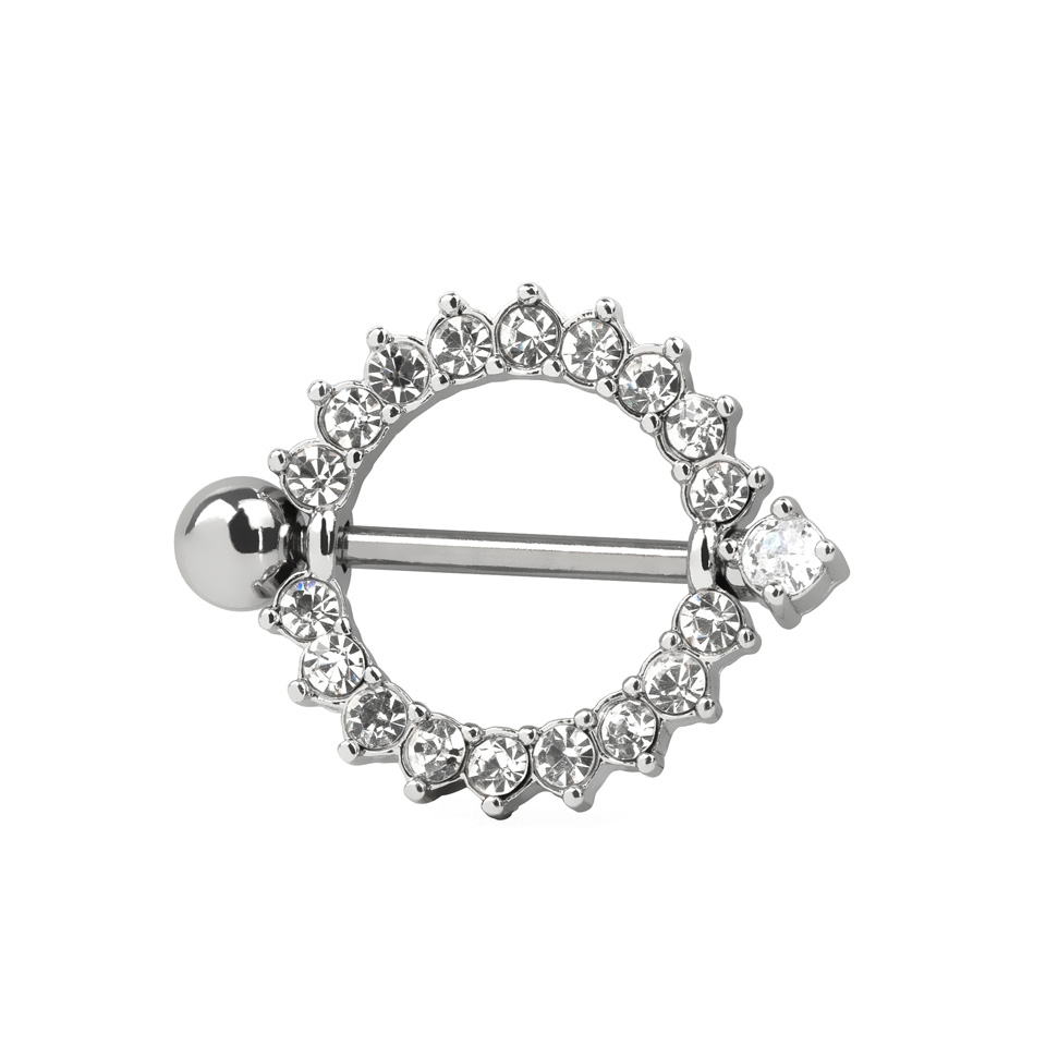 Her ser du en smuk og stilfuld brystpiercing med rundt skjold og diamantlignende klare sten som pryder hele smykkets kant, det er i sandhed et smykke som er enhver gudinde værdig. Dekorer dit bryst med dette fantastisk flotte brystskjold og du vil føle det som var du selveste Cleopatra.