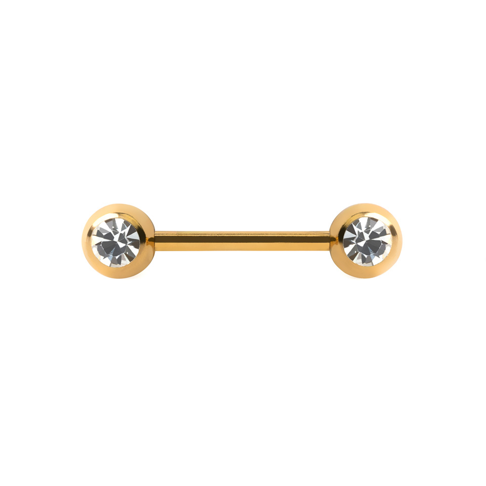 Grøn, lilla, sort, guld og sågar en sprudlende multifarve, er bare nogle af de mange lækre farver, som denne flotte brystpiercing fås i. Du får her en simpel lige stav til din brystpiercing, som fås i et væld af skønne farver der virkelig kan pifte din brystpiercing op med et flot nyt look.