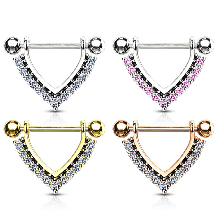 Dette smykke er beregnet til brug i brystet. Så er du udstyret med en brystpiercing, så er du havnet det helt rigtige sted. Smykket henvender sig nok mest til det kvindelige klientel med sine mange sten og de forholdsvise feminine farver. Staven er 18 mm. lang, det er dog ikke et mål du kan bruge til noget, da vedhænget hænger fast i staven og dermed gør det frie stykke som skal igennem nipple en smule mindre. Så mellem de to bøjler er der ca. 14 mm. hvilket bør passe til de fleste.