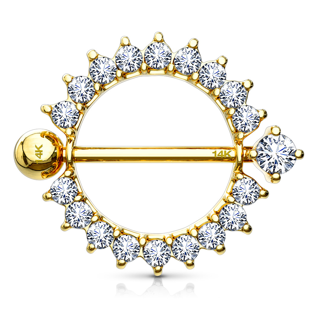 Står du og mangler du et eksklusivt brystsmykke til din brystpiercing? Så har du nu muligheden for at pryde dit bryst med et smykke lavet af ægte 14 karat guld, med flotte klare sten hele vejen rundt langs skjoldets kant. Smykket er designet så det ligner en lille sol hvor de mange glitrende smukke sten, skinner om kap med hinanden. Hver enkelt sten er direkte indfattet i guldet og er altså ikke limet fast.