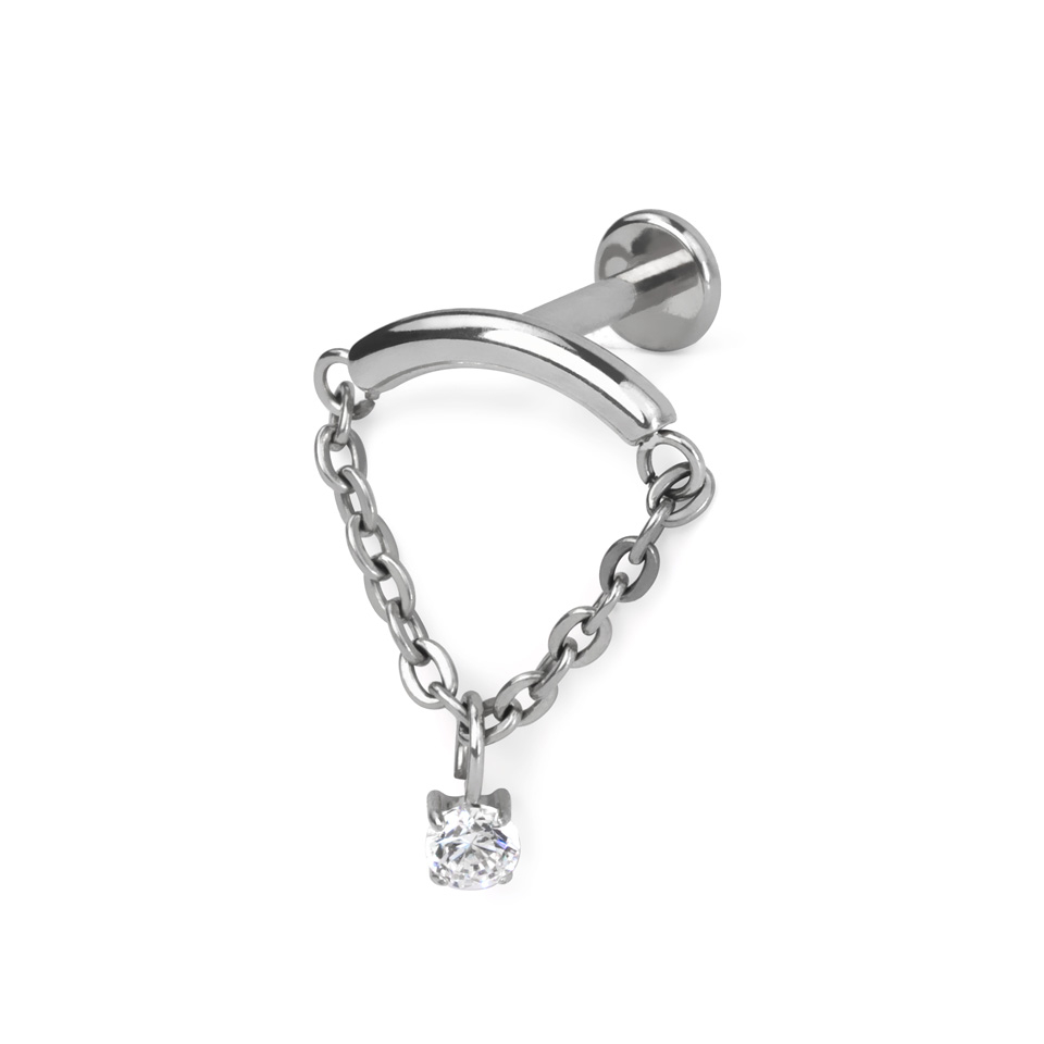 Denne elegante titaniumlabret kan prale af en buet stav, hvis ender er forbundet af en kæde, der hænger nedenunder. Fra en lille ring på kæden hænger desuden en bezel-sat sten af kubisk zirconia. Da stenen ikke sidder fast i kædens led, vil den altid hænge fra kædens laveste punkt, hvilket giver smykket en anderledes virkning afhængigt af, hvordan du vælger at placere det i dit øre. Det vil se godt ud i en øreflip- eller helix-piercing, enten alene eller som del af et unikt ensemble.