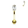 Sød og yndig buet stav af 14 karat guld med en smuk sten i den ene ende. Stenen er let aflang og bliver holdt fast af fire små fangarme som griber rundt om den bagfra. På den måde er den i langt mindre risiko for at falde ud, end hvis den f.eks. blot var limet fast. Du vælger selv om du vil have din nye guldstav med en klar eller en lyserød sten.