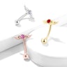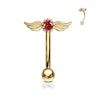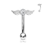 Staven du ser på billedet herover er en buet stav og gør sig specielt godt egnet i øjenbrynet. Staven er 8 mm. lang og 1,2 mm. tyk. I bunden af staven sidder en 3 mm. stor kugle som kan skrues af og på. I toppen af staven er der ikke nogen kugle som man normalt ser. I stedet for er der et sæt englevinger, som strækker sig til hver sin side. I midten af vingerne sidder en flot sten, som alt efter dit valg af materialefarve også er forskellig.