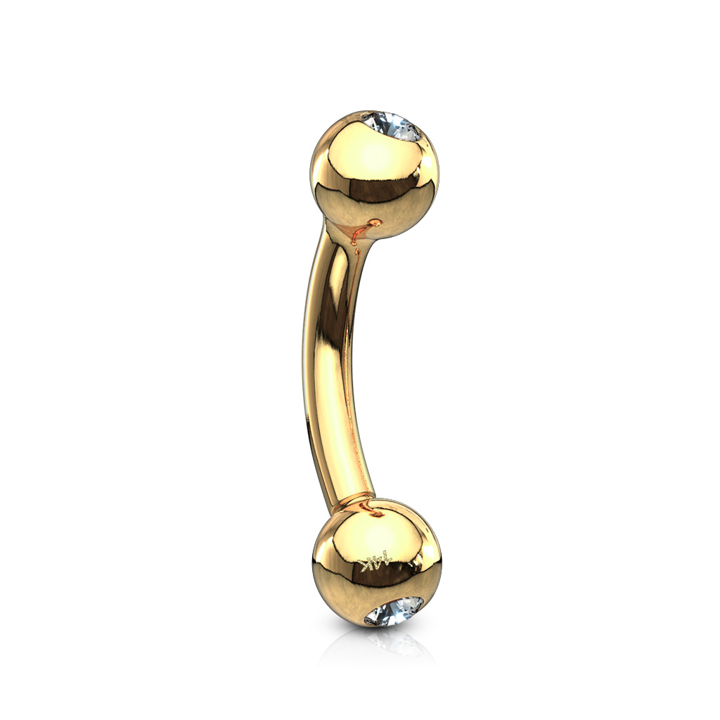 Smuk og feminin buet stav af 14 karat guld med en funklende klar sten i begge kugler, som er monteret i enderne. Denne stav er perfekt til dig som går efter det tidløse klassiske look med et diskret strejf af yndefuld elegance. Staven her er som en blufærdig ung pige der viser sin skønhed til verden med nedslåede øjne - frem for at føre sig frem som en popsmart prinsesse. Den er diskret, tidløs og feminin på en yderst raffineret måde. Staven fås i to forskellige længder som vælges før du lægger varen i kurven.
