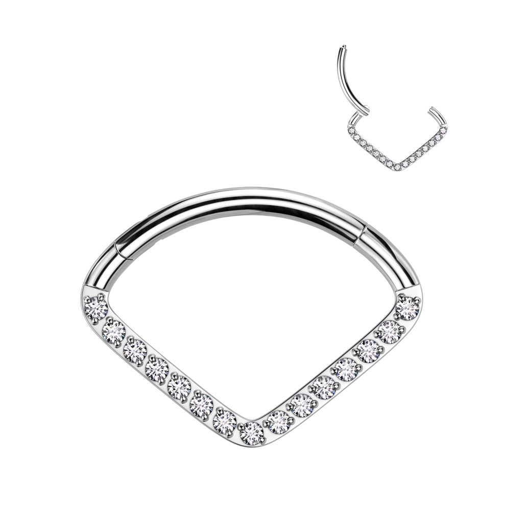 Er du i humør til glitter? Vi har det helt rigtige smykke til dig. Denne ring har et tidløst chevron-design, hvor den vinklede del er besat med klare zirconia-sten. Den buede del, som sættes i din piercing, er selvfølgelig glat af hensyn til din komfort. Ringen har det perfekte mål af glamour og er et sikkert blikfang.