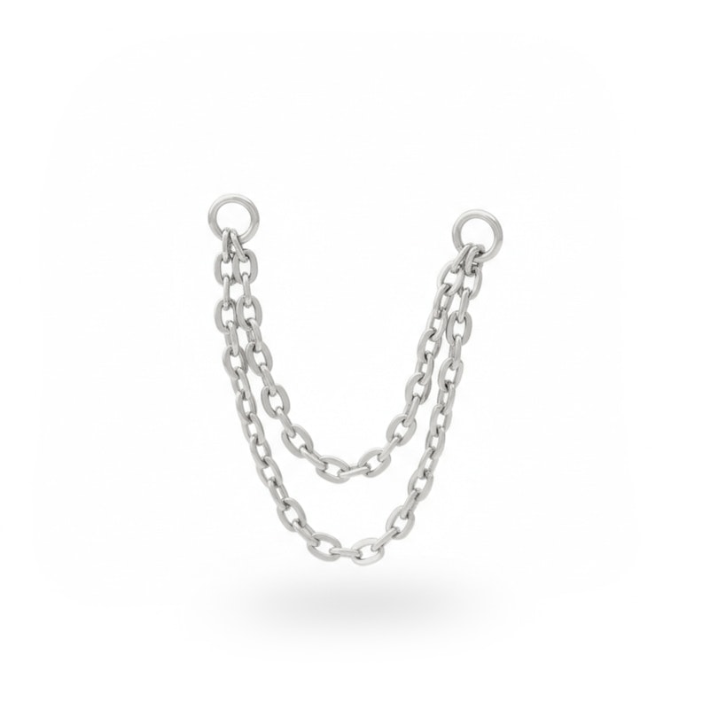 Denne smykkedel består af to titaniumkæder, der er forbundne i hver ende med en O-ring, som let kan sættes fast på dit piercingsmykke. F.eks. kan du sætte én ende i en ring eller labret i din øreflip og den anden i en ring eller labret i din helix-piercing. Mulighederne er uendelige!