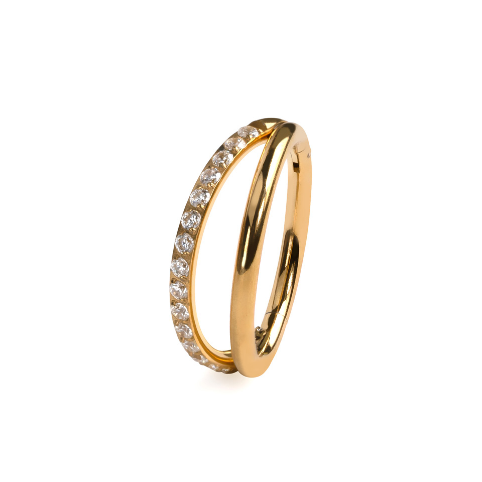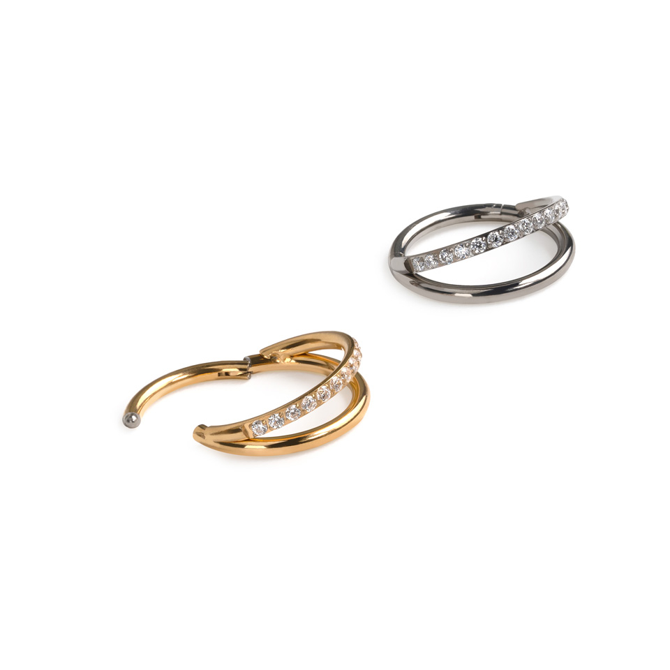 I Bodymod Trend finder du denne dobbeltring af titanium med sten på den ene bue, som gør noget friskt med et opdelt design. Den ene halvdel er glat og minimalistisk, den anden er besat med sten. To vibes, én ring.
