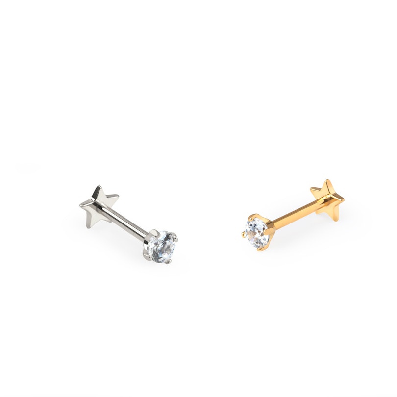 Denne titaniumlabret har en flad, stjerneformet bagende, der er perfekt til piercinger som helix eller øreflippen, hvor bagsiden er synlig.