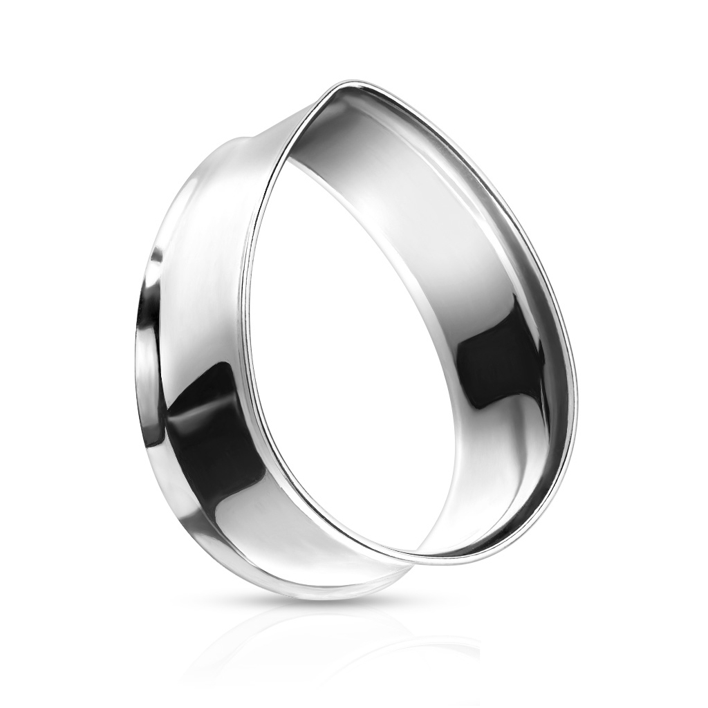Tunnelen du ser på billedet her, er lavet af kirurgisk stål. Tykkelsen på metallet er utrolig lille, så smykket kan syne større end det egentligt er. Tykkelsen er ca. 0,5 mm. Smykket er dråbeformet, eller pæreformet om du vil. Man kan vel næsten sige at dråben er en smule buttet.