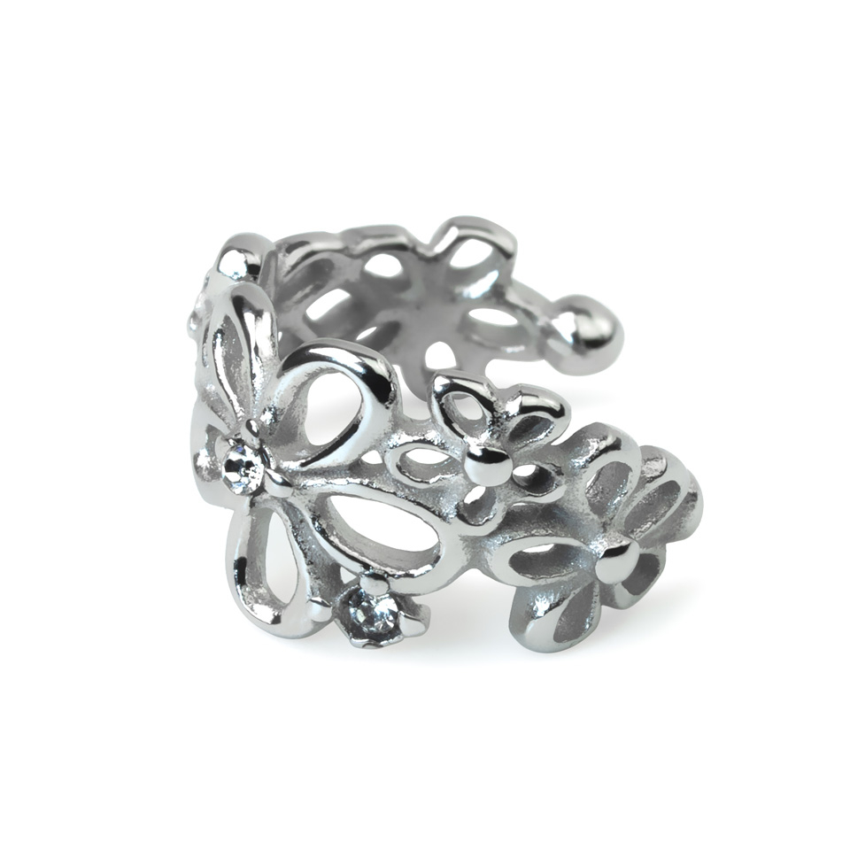 Denne fine ear cuff er dekoreret med enkle blomster i forskellige størrelser, der omkranser dit øre. Midten af de større blomster har små sten, der giver smykket et subtilt skær. Enderne har små kugler, der gør det behageligt at have på. At denne ear cuff er lavet af kirurgisk stål betyder, at den ikke ruster eller misfarver din hud. Et fantastisk smykke til at pryde dit øres arrangement uden behov for en ny piercing.