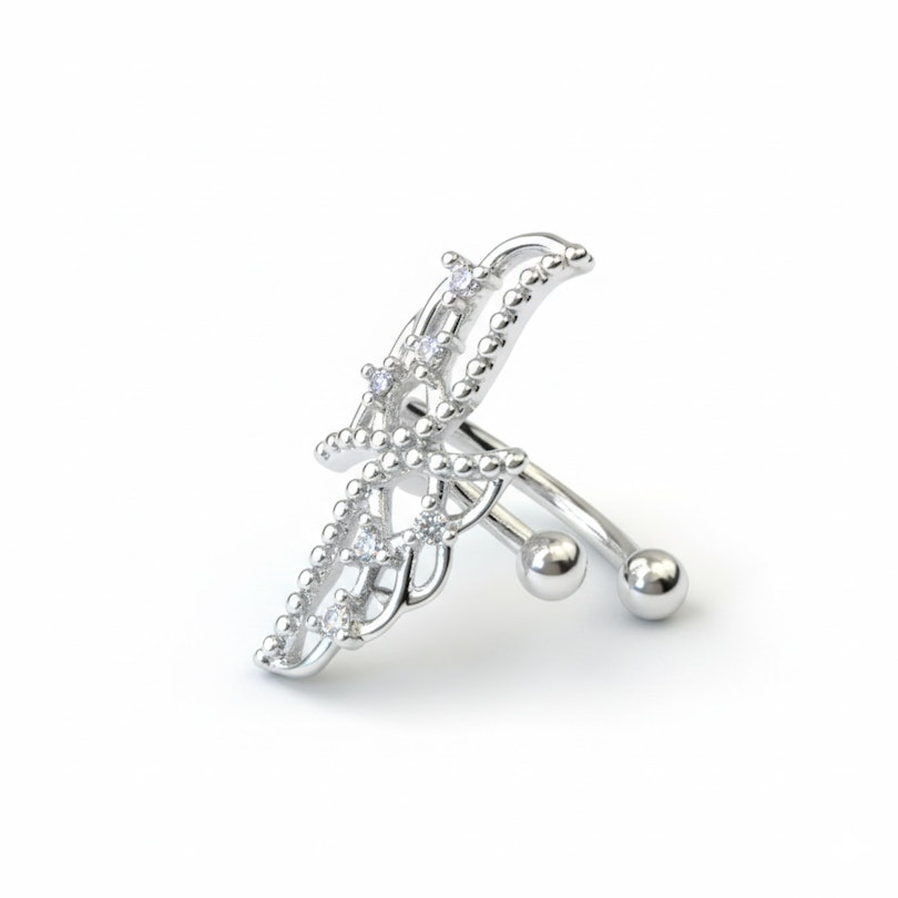 Denne glamourøse ear cuff er prydet af et par vinger med små sten og kugler. Smykket er lavet af kirurgisk stål, så det ruster ikke, misfarver ikke din hud og er virkelig holdbart.