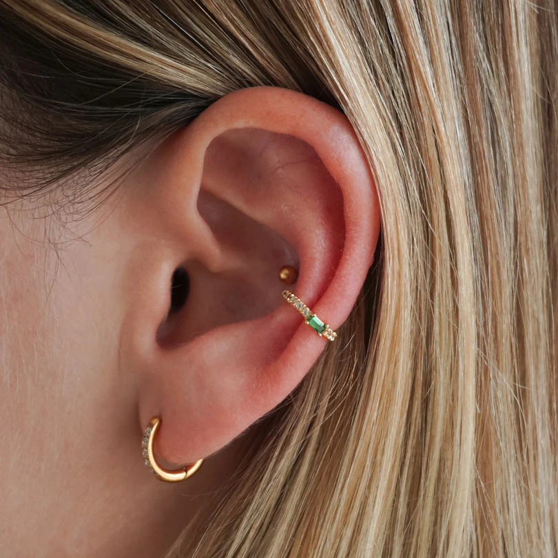 Et grønt pift kan ændre hele stemningen i et look. Denne earcuff med grøn sten giver farve uden at tage over, en nem måde at fuldende dit look med noget lidt uventet.