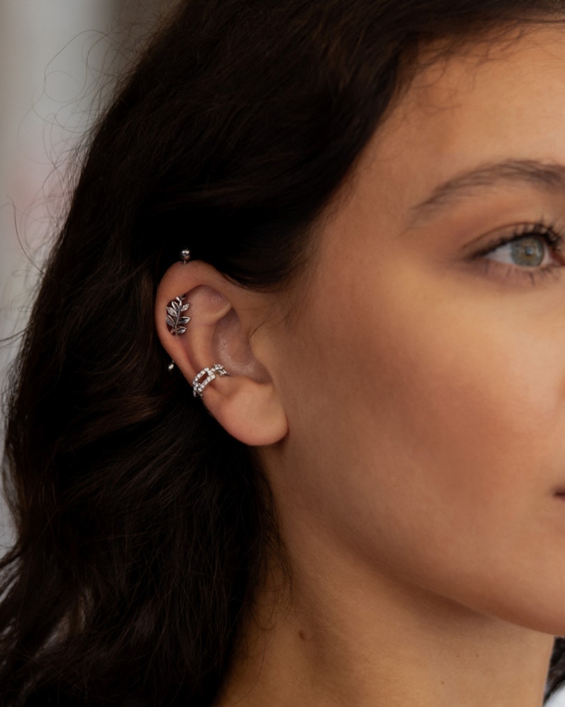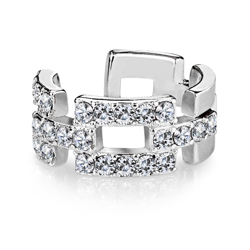Smykket er designet som, hvad der ligner en kæde af rektangler. På ydersiden af smykket, altså den side som kommer til at blive vist frem i dit øre, sidder der op til 5 små sten på hvert rektangel, så med denne earcuff kommer du ikke til at gå ned på glitter.