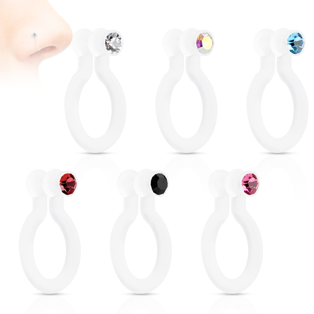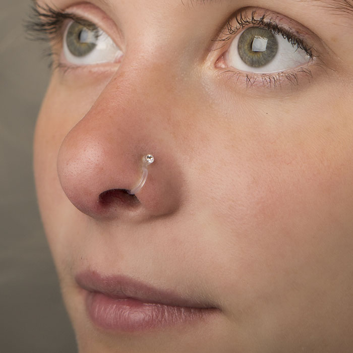 Nu kan du få den skønneste fake næsepiercing med en enkelt og diskret lille sten i, helt uden at være piercet i næsen. Dette flotte smykke ligner en lille klar ring af ptfe, som er et klart og blødt plastmateriale, med en sten lige der hvor den går “ind i” næsen. I virkeligheden er det dog blot en bøjle som sættes op omkring næsen, hvor den presses sammen fra hver sin side så den sidder i spænd omkring næseboret.