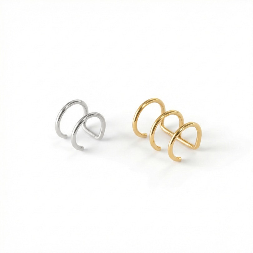 Dette smykke består af to eller tre sammensatte ringe, som er åben for neden, så der ikke skal laves hul i huden. Den sættes blot rundt om brusken øverst i øret og så ser det ud som om du har to eller tre piercinger i øret. Smykket er lavet af kirurgisk stål og derefter farvet med en titaniumbelægning.