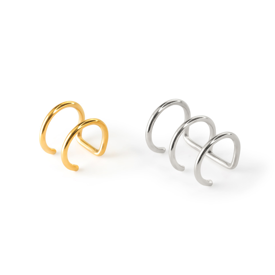 Dette smykke består af to eller tre sammensatte ringe, som er åben for neden, så der ikke skal laves hul i huden. Den sættes blot rundt om brusken øverst i øret og så ser det ud som om du har to eller tre piercinger i øret. Smykket er lavet af kirurgisk stål og derefter farvet med en titaniumbelægning.