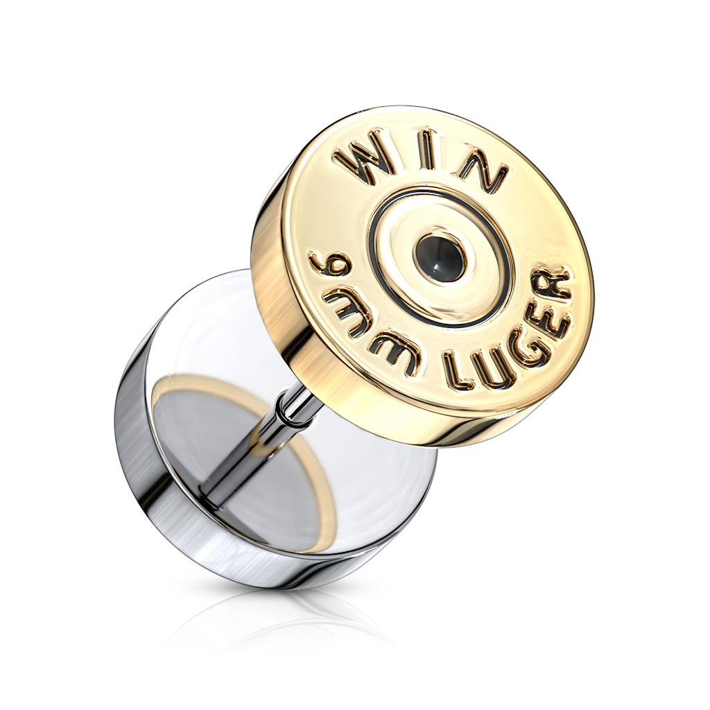 Her ser du en fake plug med bagsiden af en patron. Grunden til, at den er fake, er illusionen af, at du har en 10 mm stor plug i øret, selvom du kun har et helt almindeligt 1,2 mm piercinghul. Det er ikke til at se forskel på de to, når smykket først sidder i øret. På grund af patronstørrelsen er der også god plads til, at den flotte tekst kan folde sig ud og vise sig fra sin bedste side - det havde været en skam, hvis smykket var så småt, at man nærmest ikke kunne se eller læse teksten.