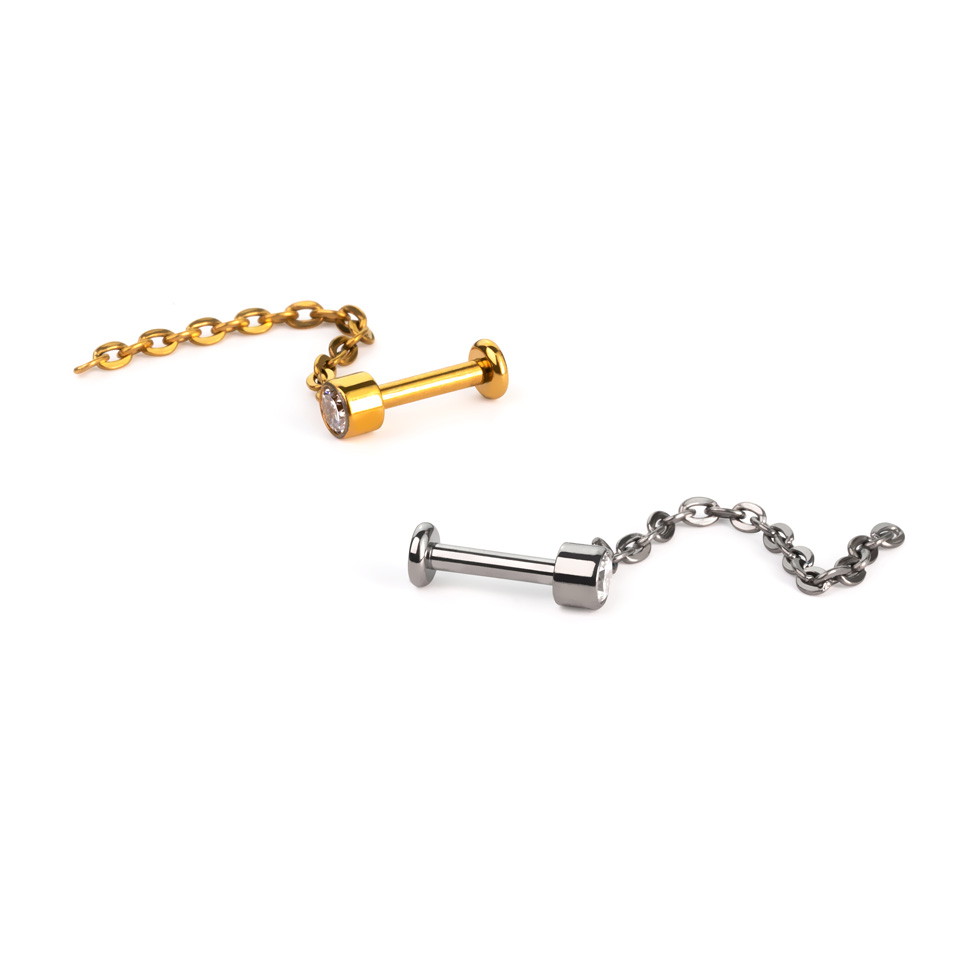 Denne fine labret har en lille bezel-sat sten med en diameter på 3 mm. Fra bunden af stenen hænger en 26 mm lang kæde. Labretten tager sig fantastisk godt ud i en tragus-, helix- eller øreflippiercing og komplementerer smukt dine andre øresmykker.