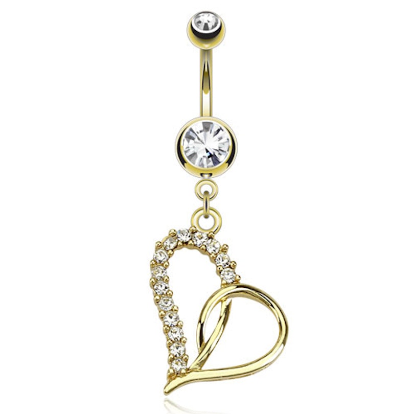 Her har du et smukt og yderst elegant hjerte i et helt unikt design, som vil få enhver navle til at lyse langt væk af feminin skønhed. Navlepiercingen her er belagt med et tyndt lag ægte 14 karat bladguld. Staven har en standardlængde på 10 mm. og både top -og bundkugle er dekoreret med en flot klar sten, som matcher de klare sten i vedhænget.