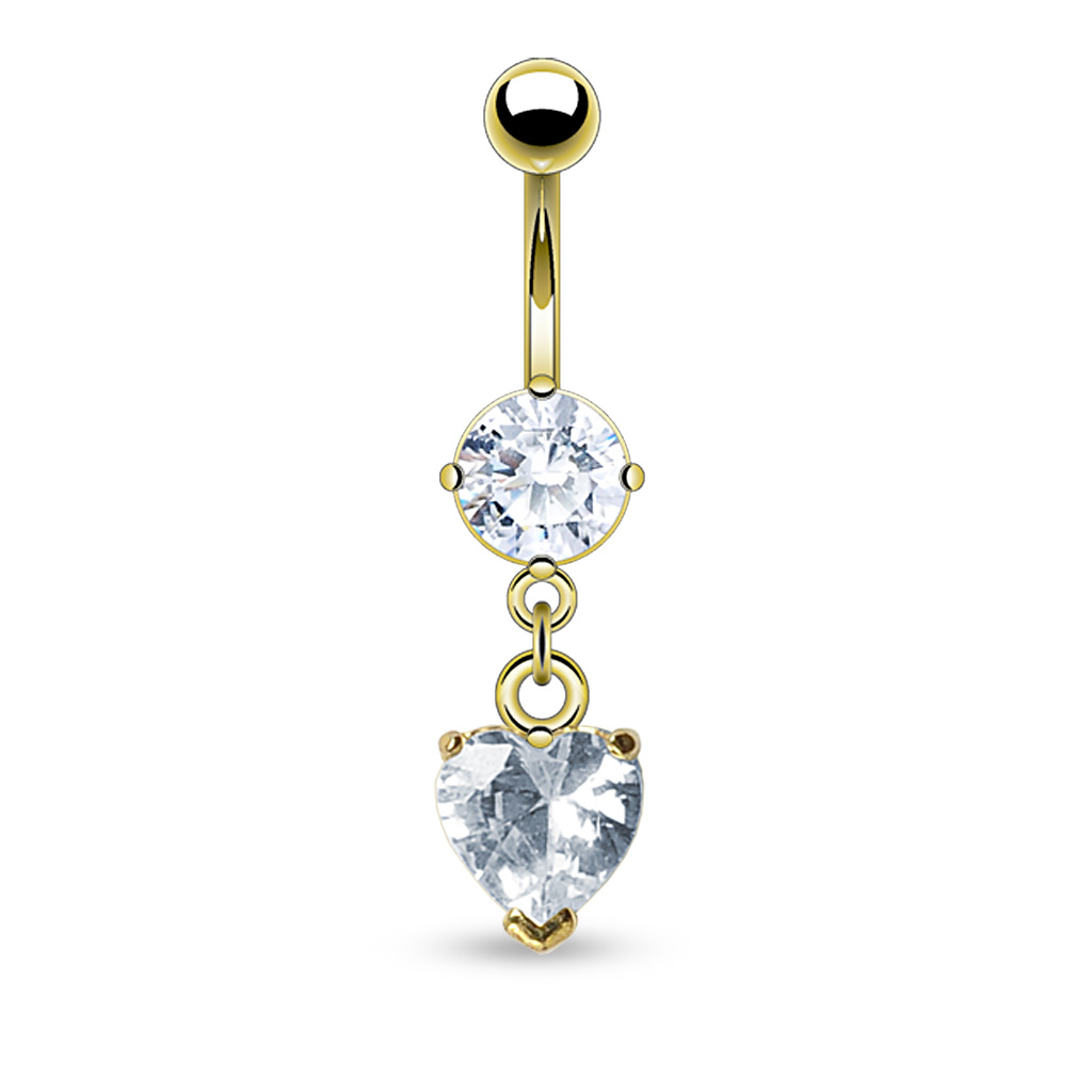 Guldbelagt navlepiercing med sten og hjerteformet vedhæng