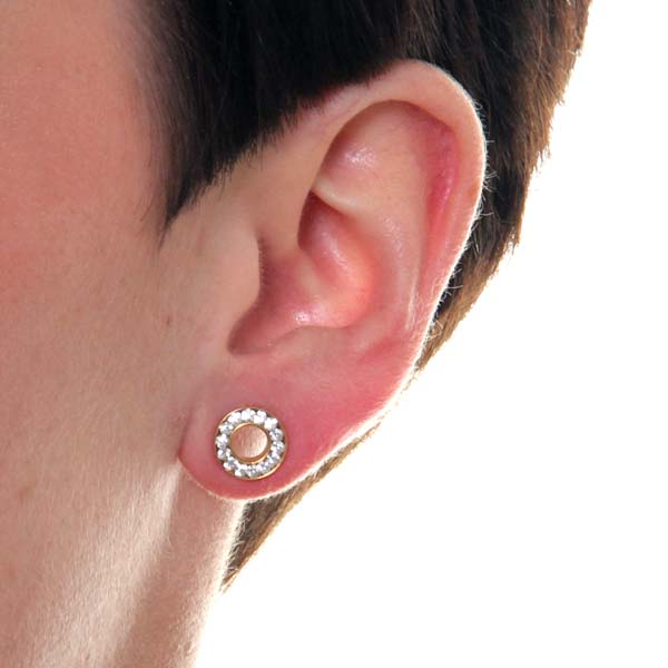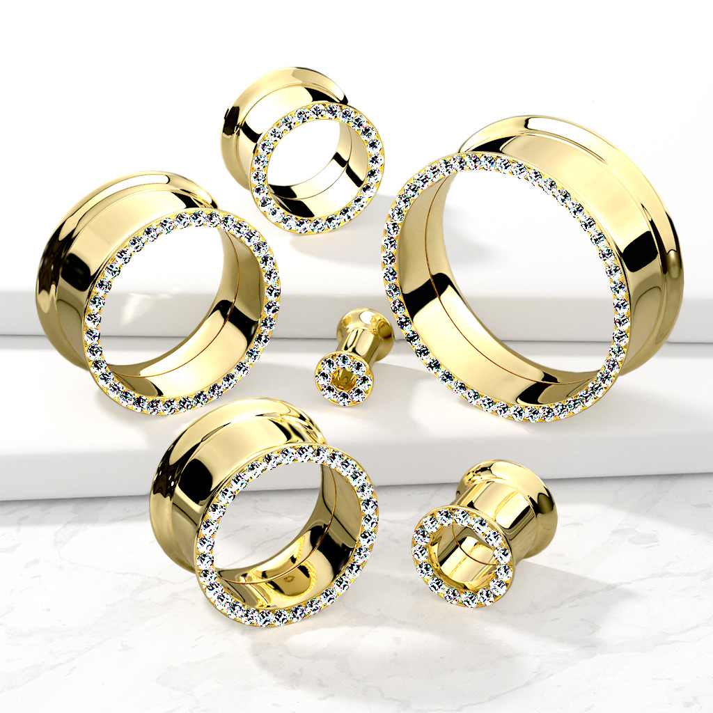 Denne tunnel er lavet af guldbelagt kirurgisk stål og er prydet med små klare sten rundt om i hele kanten.