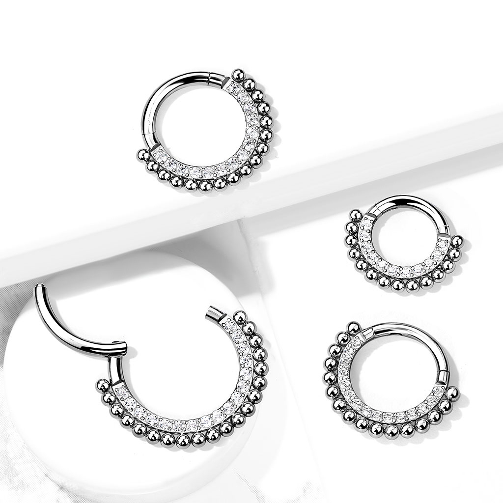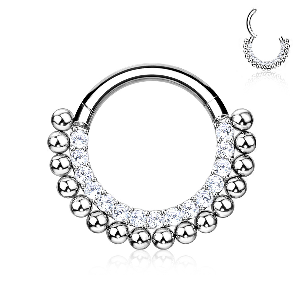 Titanium er et af de bedste materialer til din piercing. Af samme grund er det også derfor man får isat et startsmykke af titanium når man bliver piercet. Normalt er smykker af titanium kedelige. Dvs. uden sten og udsmykninger på. Det laver dette smykke om på med sine mange sten og de små runde kugler yderst på ringen.