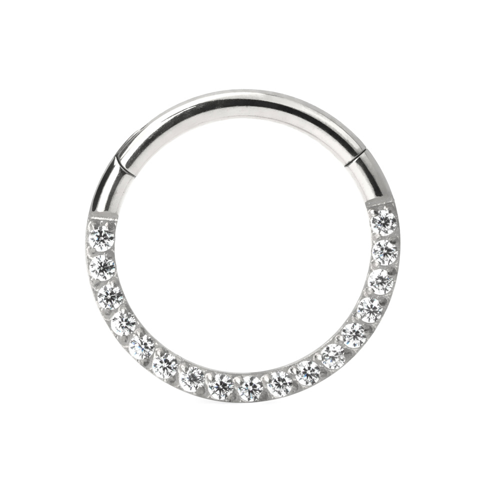 Den forreste del af ringen har en række med funklende sten. Du skal overveje placeringen af stenene alt efter hvilken piercing du vil have ringen til. F.eks. er stenene placeret perfekt til en septum eller daith piercing, men til næseborene vil du nok foretrække et design hvor stenene peger udad.