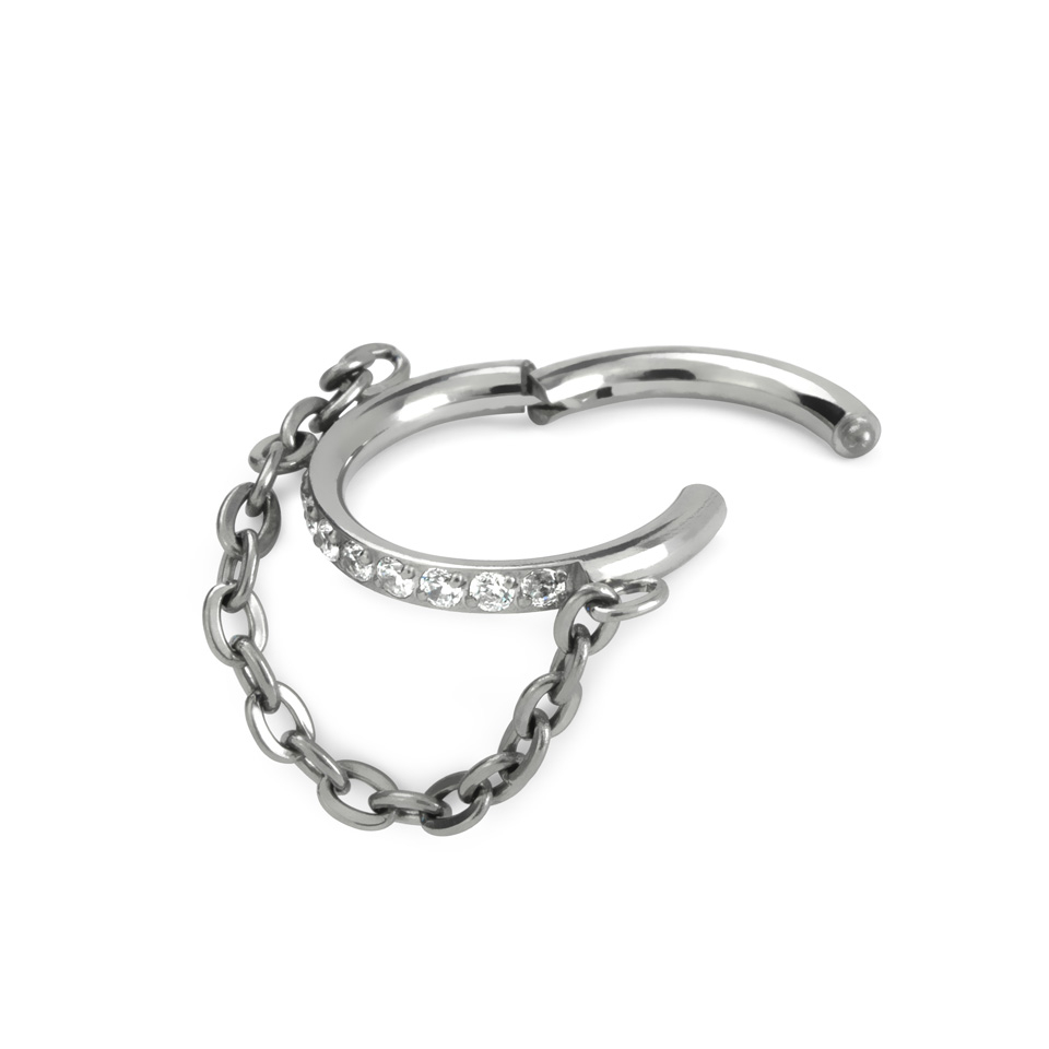 Hængslet ring af titanium med en række fine sten og en kæde. Kæden sidder fast i begge sider og hænger lidt under bunden af ringen.