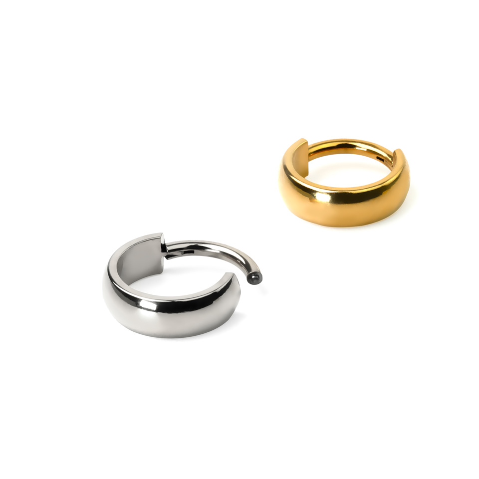 Denne hængslede titaniumring har en stor, udadvendt bue, der i sandhed gør sig bemærket. Den fås i 4 farver: sølv, sort, rødguld og guld.