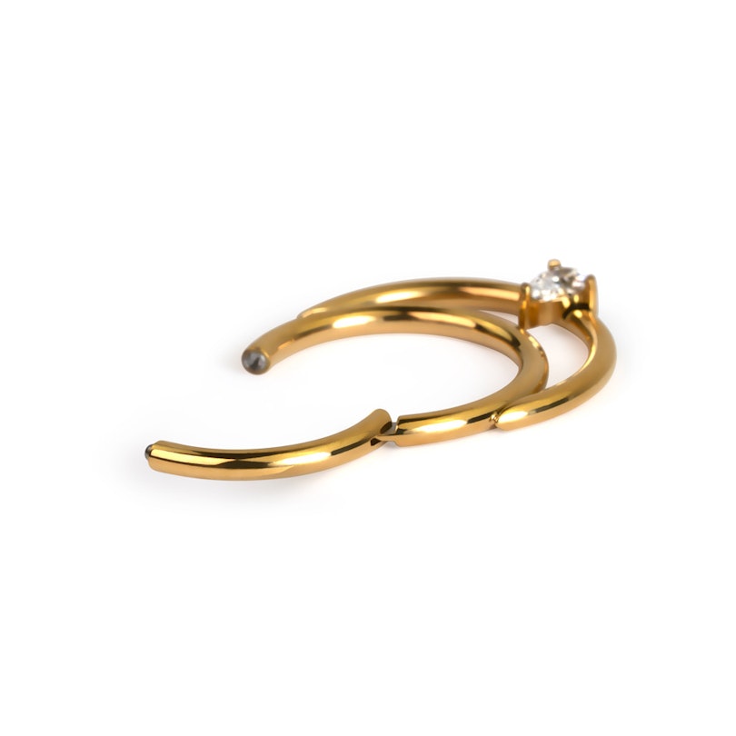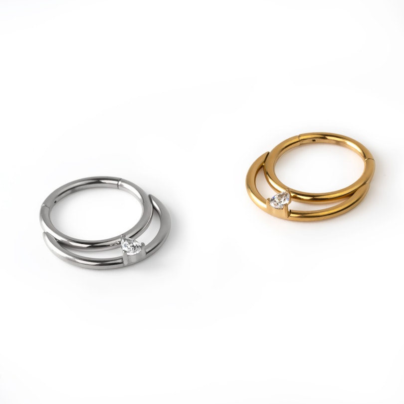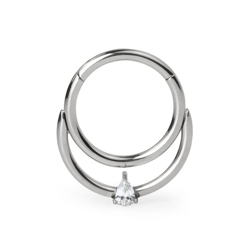 Hængslet segmentring af titanium med dråbeformet sten placeret i balance på 2 bånd. Denne skønne ring er mere end elegant med den tidløse dråbeform, der forbinder de 2 ringe og skaber et signatursmykke. Smykket fås i både guld- og sølvfarve. Det har en trådtykkelse på 1,2 mm og fås i diameteren 8 mm og 10 mm, hvilket gør ringen perfekt til en helix-, daith- eller septumpiercing.