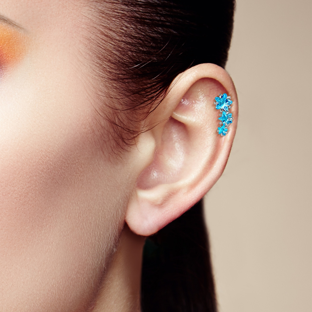 Lad din helixpiercing stråle om kap med stjernerne, med dette funklende flotte helix smykke. Smykket er udstyret med tre smukke stjerneformede sten, som sidder på række under hinanden. Stjernerækken buer ganske svagt, så smykket følger dit øres naturlige runding.