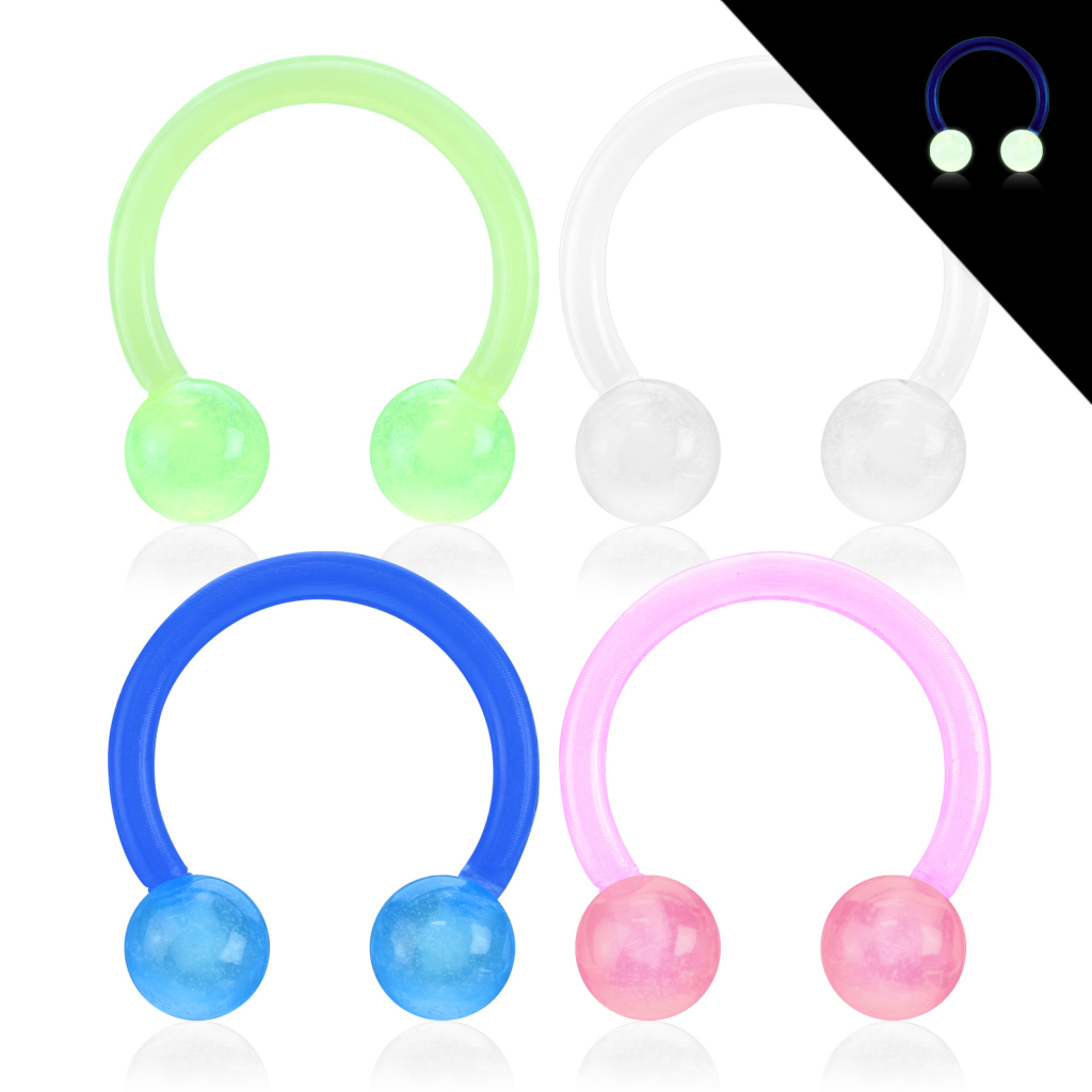Hvis vi nu slukkede lyset, så ville hesteskoen på billedet ovenfor lyse op. Du kigger nemlig på en selvlysende hestesko, der er lavet af akryl. I dagslyset ligner denne hestesko måske bare en helt almindeligt hestesko, men når mørket falder på, så vil hesteskoen lyse. Dette gør smykket perfekt til fester med masser af farver. Hesteskoen her kan bruges flere steder på kroppen, alt efter hvor du er piercet - så længe målene på smykket stemmer overens med målene på din piercing. Smykket bruges ofte som en septumpiercing, men det kan også bruges som en øjenbryns- og ørepiercing, så valget er helt op til dig.
