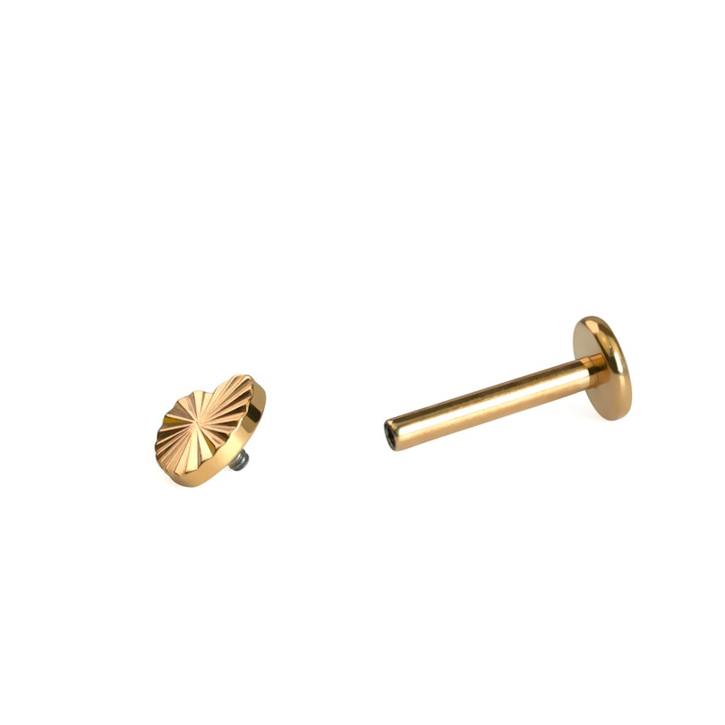 Toppen på denne charmerende, hjerteformede labret kan prale af en smuk tekstur, designet med fine linjer, der stråler ud fra midten og skaber en slående effekt, når den fanger lyset.