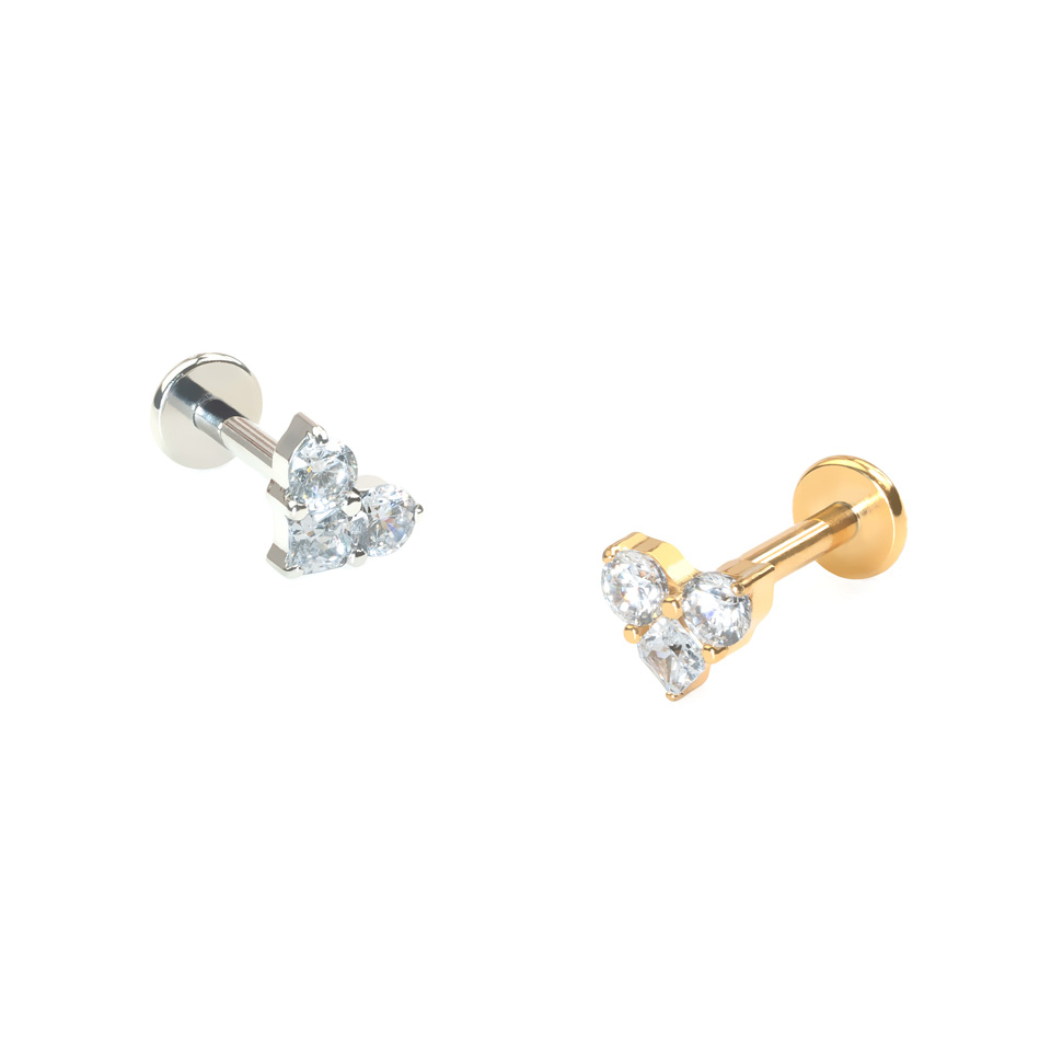 Denne titaniumlabret har 3 CZ-sten arrangeret i en hjerteform. De to øverste sten er runde, mens den nederste er firkantet. Smykket har indvendigt gevind og fås i farverne guld eller sølv. Den søde labret vil se fantastisk ud i en række forskellige ørepiercinger. Den måler blot 5 mm på det bredeste sted. Den flade bagside sikrer komfortabel brug.