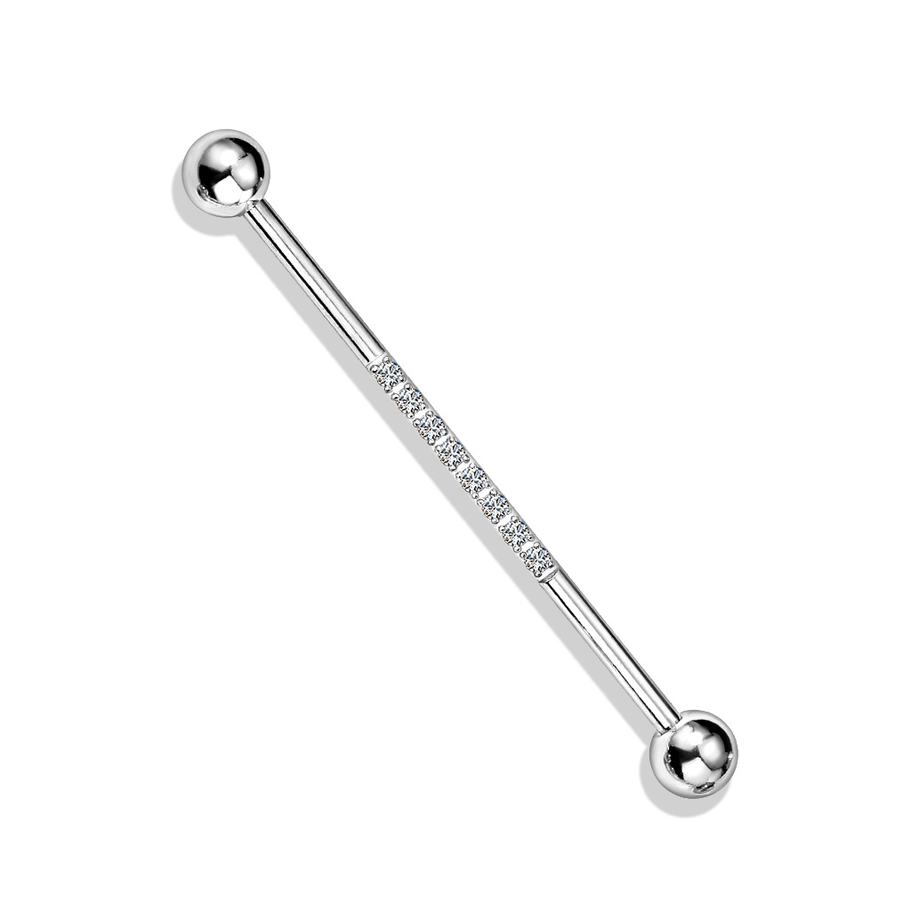 Har du en industrial piercing i øret, så har vi her et smykke til dig. Smykket består af en lige stav, som du kender den, med to kugler - En i hver ende. Midt på staven er der udskåret en lille fordybning, hvor der er placeret 8 små sten med en snorlige OCD-perfektionistisk præcision. Staven der er lavet af kirurgisk stål findes i flere forskellige farver og det samme gør stenene. Det er dog kun den blanke sølvfarvede udgave der kan vælges med andre stenfarver en klar. med andre ord; De farvede stave kan kun vælges med klare sten.