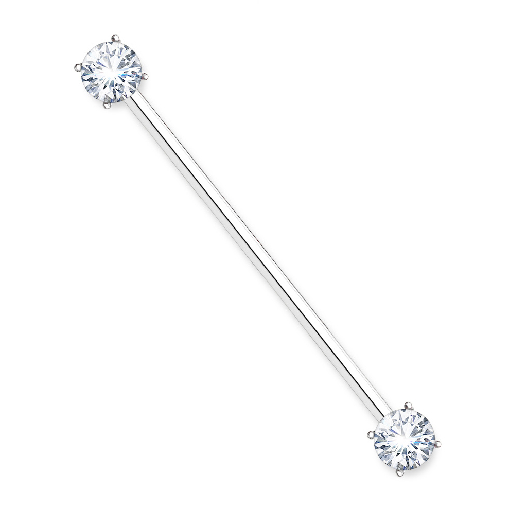 På billedet ovenfor finde du en af de mere elegante industrial stave. Dette smykke er lavet af kirurgisk stål, hvor der sidder to klare og funklende sten for hver ende af smykket. Stenene i smykker har fået en rund form og sidder indkapslet i en form for skål, som rager op fra staven af smykket. Skålen er samme farve som den farve du vælger til staven. Skålen har fire arme, som går op ved siden af stenene og en smule over, der skulle forestille at holde fast i stenen.