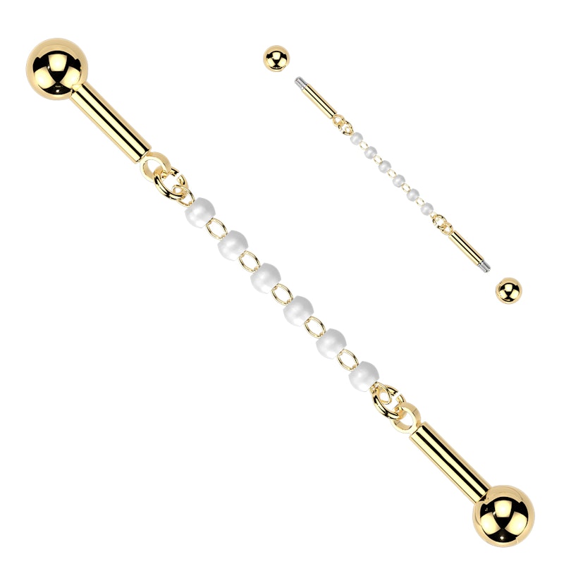 En industrial-stav med perlekæde, der giver den rå industrial-form et blødere twist. En række små, perleagtige kugler løber mellem enderne, forbundet af fine kædeled, der giver staven et dressed-up look. Fås i guld- og sølvfarve og er det smykke, du vælger, når du vil have noget andet end den sædvanlige lige stav.