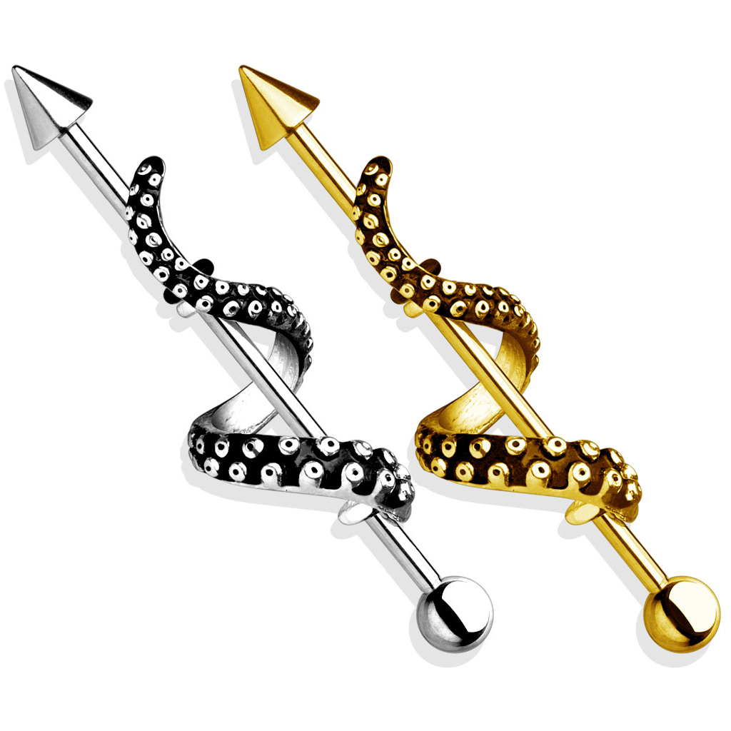 Hvis du leder efter noget helt unikt og top nice til din industrial piercing, så er du landet det rette sted! Denne fede industrial stav er formet lidt som en pil, med en spike i den ene ende og en kugle i den anden. Det er dog det midterste stykke, mellem de to piercinghuller, som er det mest interessante her. For mellem de to ender, finder du nemlig en virkelig flot og meget livagtig blækspruttearm. "Armen" er sort i bunden og er endda dekoreret med små sugekopper fra ende til anden.
