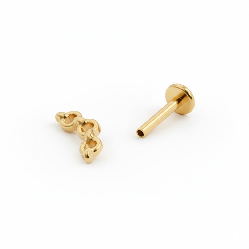 Fås i farven guld eller sølv. Kædedesignet giver kant, uden det bliver for meget. Smykket er lavet af ASTM F136 titanium, der er allergivenligt, vandfast og kan holde hele livet med den rette pleje. Det indvendige gevind gør det irritationsfrit at sætte i og holder det sikkert på plads.
