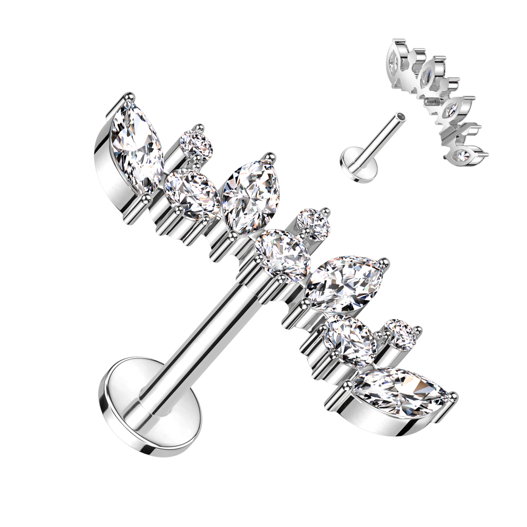 En smuk labret af titanium med et mønster, der skifter mellem runde sten og marquise-skårne sten. Smykkets kurve passer særligt godt til piercinger i øreflippen og helix, hvor den følger ørets form.
