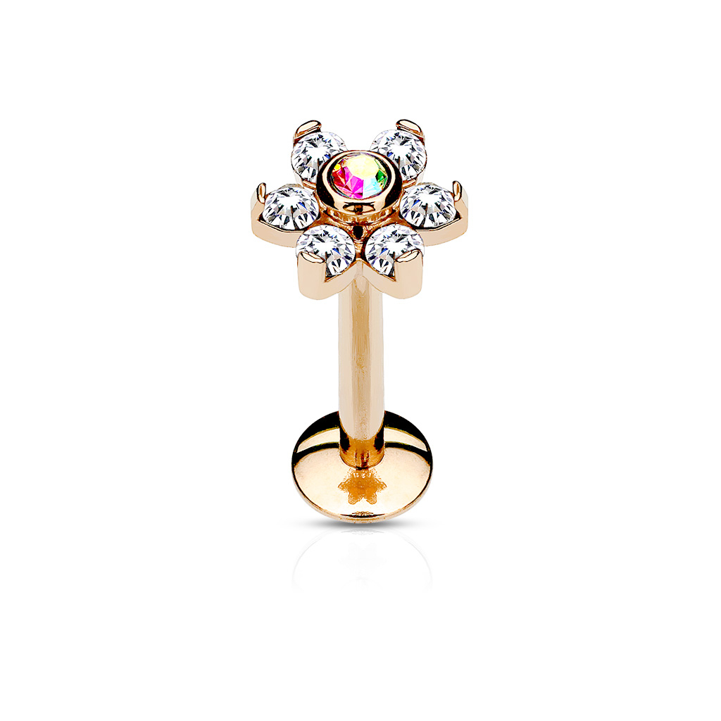 Labret med blomst og indvendigt gevind-Rosaguld-Aurora Borealis