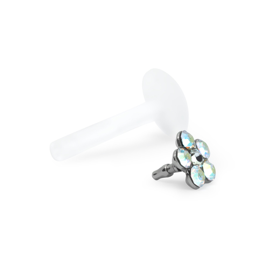 Flot labret med en formation af små glimtende sten som tilsammen former en blomst, til dig der gerne vil gøre lidt ekstra ud af dit smykkevalg. De fleste labretter består som regel kun af en enkelt lille kugle eller sten, så denne her skiller sig virkelig ud med de hele 6 små sten som danner blomsten.