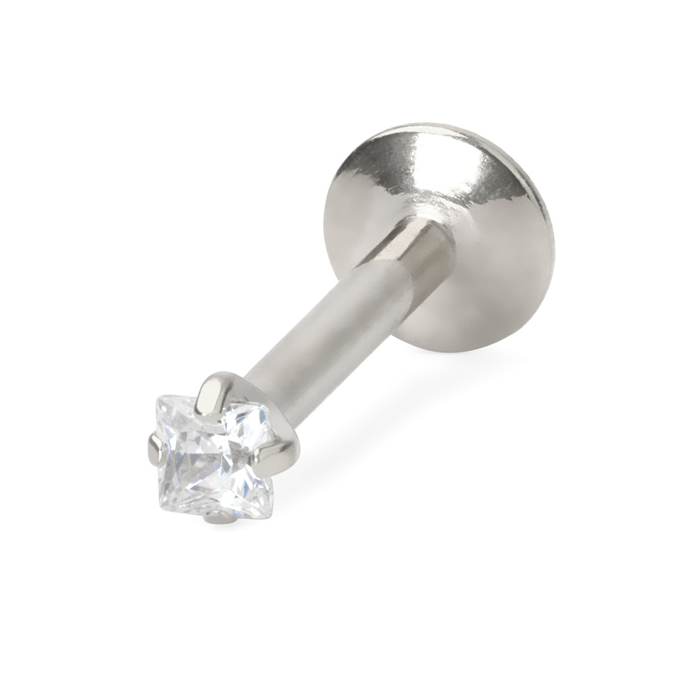 Denne labret af kirurgisk stål er pyntet med en firkantet sten, der sidder fast med tænder, og har indvendigt gevind.